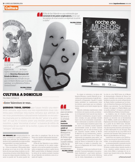 Queridos todos, espero que hayan tenido una excelente semana, aquí estoy otra vez esperándolos muy contenta para comenzar esta nueva semana que además de ser muy prometedora culturalmente hablando se encuentra marcada por la celebración del día del “amor y la amistad”, el cual en sí mismo pone una terrible presión sobre nosotros, o para “encontrar el amor” a manera de refrito de telenovela de las nueve de la noche, o para ser los mejores “amigos” del mundo.