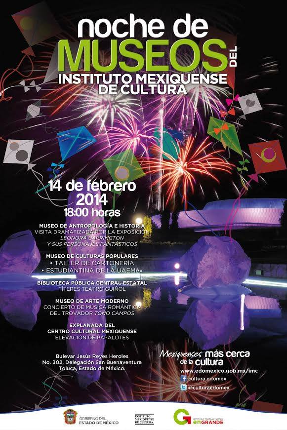 Si no tienen plan romántico para el día del amor y la amistad, resulta bastante recomendable asistir al Centro Cultural Mexiquense, que se viste de fiesta y que por segunda ocasión celebra la Noche de Museos en sus instalaciones, comenzando a las 16:00 horas con el Taller de elaboración de Papalotes para niños, en el Ágora del Museo de Antropología e Historia de Toluca, la intención es que al as 18:00 horas se realice la elevación masiva en la Explanada del Centro Cultural Mexiquense.